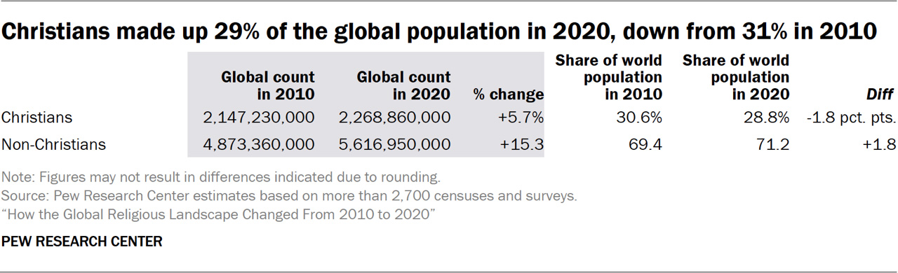 Christianity remains the largest religious group globally, comprising 29% of the population in 2020. However, its global share dropped from 31% in 2010 due to slower growth relative to non-Christian populations. The decline was most evident in Europe and North America, with a significant drop in countries like the United States (from 78.3% to 64%), the UK, France, Uruguay, and Australia, where Christians now form less than half the population.