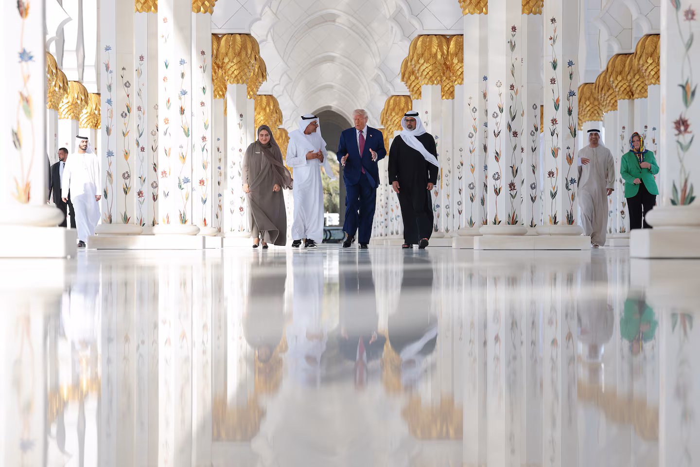 At the mosque, Trump walked barefoot through its ornate corridors, taking in the delicate arches, gold-accented pillars, and floral designs. “It’s breathtaking. This is an incredible culture,” he commented, mingling with other dignitaries and press.